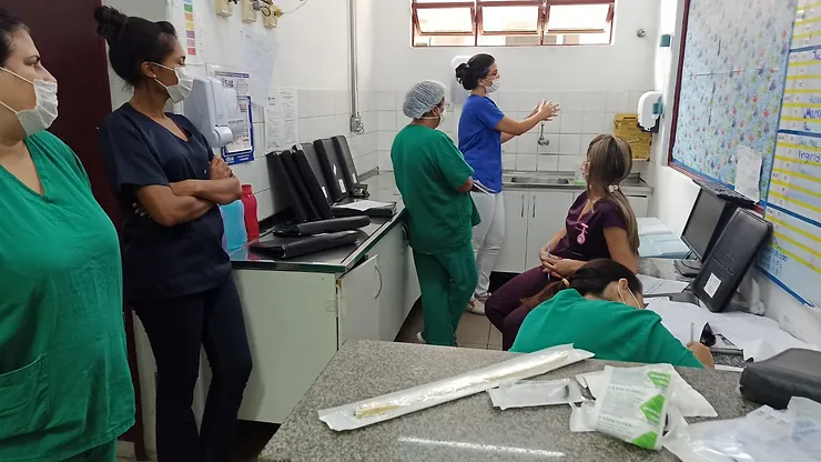 Foram realizados treinamentos no Complexo Hospitalar de Ibirité, abrangendo setores da UIA, Centro Cirúrgico, CTI e UPA com a equipe de enfermagem, além dos colaboradores da recepção, lavanderia, higienização e profissional técnica de segurança do trabalho e psicóloga. Com os colaboradores da higienização foi realizada a abordagem voltada para o controle de infecção hospitalar, lavagem das mãos utilizando a técnica adequada, o uso correto dos sanitizantes, os tipos de desinfecção, assepsia e lavagem.